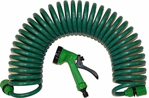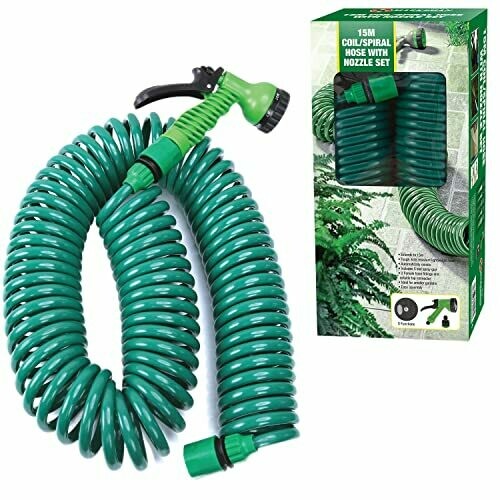 This retractable garden coil hose pipe is perfect for all your watering needs. It is durable and of excellent quality, with a convenient coil shape for quick deployment and storage. Includes 2 female hose fittings, outside tap connector, tough kink-resistant lightweight hose, and 5-dial spray gun. Automatically recoils and extends to 10 meters. Easy assembly for hassle-free use.