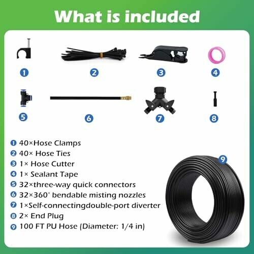 • 360° Drip Irrigation System comes with all necessary accessories: 100 ft PU drip irrigation hose (Diameter: 1/4 in), 32 pcs 360° bendable misting nozzles, 32 pcs three-way quick connectors, 1 self-connecting double-port diverter, 2 end plugs, 40 pcs hose clamps, 40 pcs hose ties, 1 hose cutter, and 1 roll of sealant tape, providing a one-stop solution for irrigation installation and use.