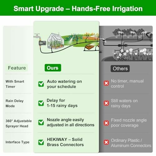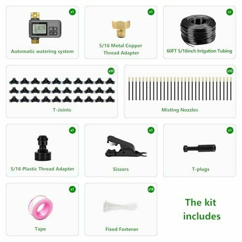 - Heavy-Duty Build – Weather-resistant & leak-proof: Designed to last through all seasons. Featuring rustproof aluminum connectors, UV-resistant tubing, and leak-proof silicone seals, this system is built for long-term performance in gardens, patios, greenhouses, and more.