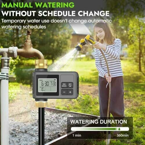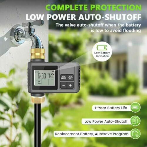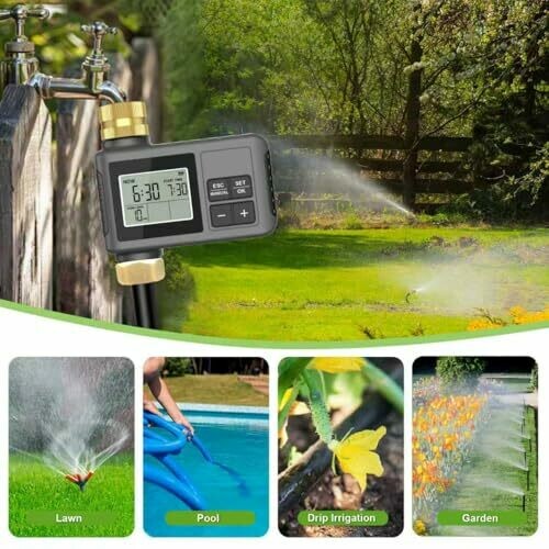 - Smart Timer Included – Hands-free watering, fully programmable: No more daily hose duty. Our built-in automatic timer lets you set precise watering schedules by time, frequency, and duration. Activate Rain Delay Mode (1–15 days) to pause irrigation when it rains, then resume your custom schedule automatically—plus a Child Lock for peace of mind. Note: Batteries are not included in the timer, please follow the instructions to set the water dispensing time.