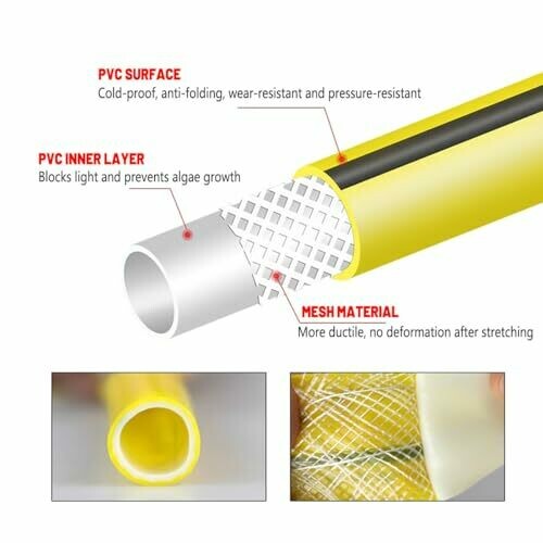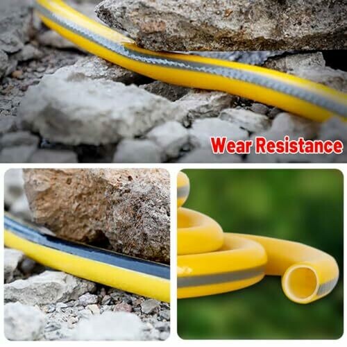 This reinforced garden hose is durable, flexible, and anti-kink, making it perfect for various outdoor tasks like watering, car washing, and patio cleaning. Available in multiple lengths, constructed with wear-resistant PVC, and inner mesh layer. Ideal for all-season use.