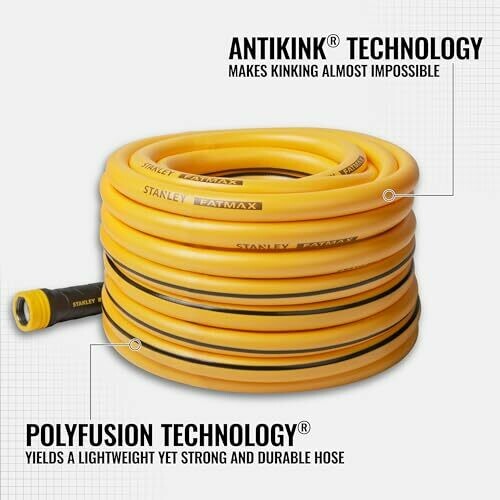 The Stanley FATMAX Professional Grade Water Hose features advanced technologies to make your work outdoors stress-free. The Polyfusion Technology combines polyurethane and PVC, making the hose lightweight and easy to work with, while the AntiKink technology provides extreme elasticity to keep kinking at a minimum. Wrench-free anodized aluminum crush-resistant couplings have heavy-duty, easy-to-grip collars at both ends to make installation easy. This hose is scratch- and abrasion-resistant and supplies up to 500 PSI burst strength.