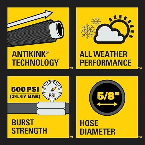 • All-weather Performance: The hose features top-quality material and construction and is guaranteed to perform through the toughest jobs. It is scratch- and abrasion-resistant and supplies up to 500 PSI burst strength.