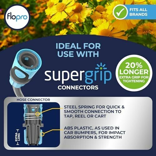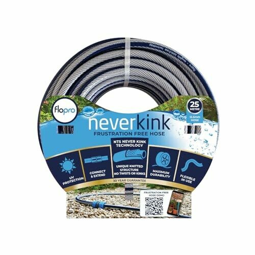 The Flopro 70309031 Flex-flo Kink Free Technology Hose 25m + Coupling Connector in blue color is a premium quality hose designed to provide a frustration-free watering experience. The patented NTS inner knitted mesh layer prevents twists and kinks, ensuring smooth water flow. Made from 25% recycled PVC, this hose is durable and long-lasting, with a dual outer layer that protects it from UV rays. The hose also comes with a hose extender for added convenience.