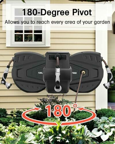 • Garden hose reel wall-mounted design, coupled with a 180 swivel bracket, makes maneuvering around your yard effortless. Wall mounted garden hose reel allows you to easily water different parts of your garden without moving the reel, without the hassle of tangled hoses or manual winding.