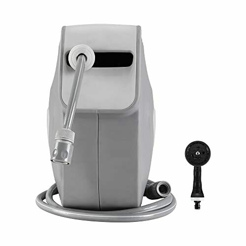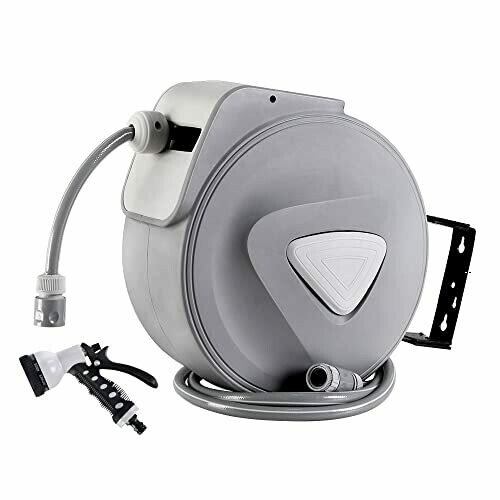 This versatile hose reel features an integrated storage solution and auto rewind system for convenience. Constructed with UV resistant materials, it includes a 180° swivel wall mount and built-in handle for easy maneuverability.