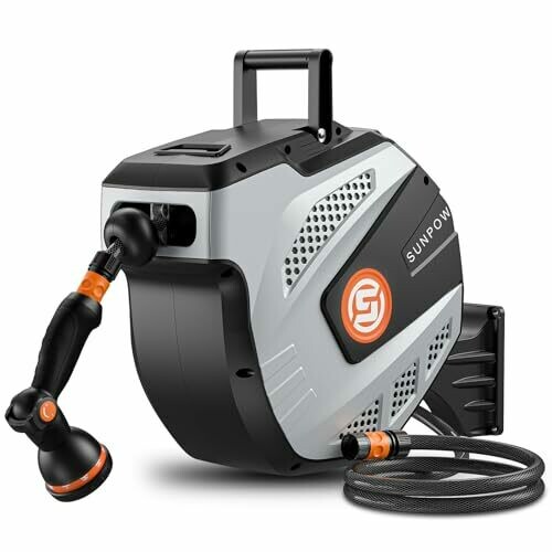 The SUNPOW Retractable Garden Hose Reel keeps your garden tidy with its wall-mounted design, smart locking system, and auto rewind feature. The pulley guide rail system ensures smooth operation, while the 10-function nozzle offers versatile watering options. Package includes all necessary hardware for easy installation.