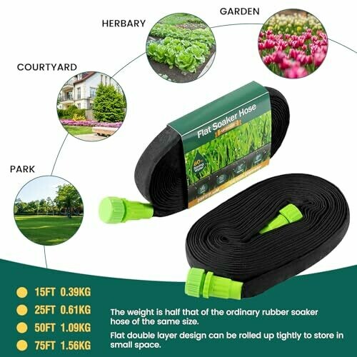 - Versatile use: The flat soaker hose is a versatile tool that can be used in a variety of settings, including garden beds, flower beds, and vegetable patches. The hose is available in different sizes such as 15ft, 30ft(2*15ft), 100ft(2*50ft), 150ft(2*75ft), allowing you to choose the right length and diameter to meet your specific watering needs. Whether you have a small patio garden or a large vegetable patch, there is a flat soaker hose that is suitable for your needs.
