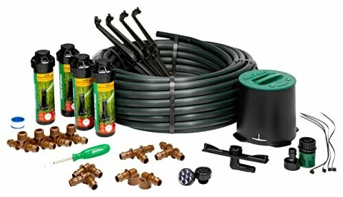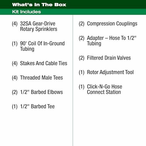• Kit contains: 90’ of 1/2" distribution tubing, (4) 32SA geared pop-up rotary sprinklers, pull-up/adjust tool, “click-n-go” hose connection, fittings, Teflon tape, (2) filtered drain valves