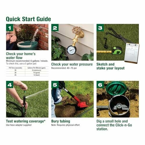 Rain Bird Corporation is a privately held company founded in 1933 during the agricultural boom in California. We’re recognized as the #1 manufacturer and provider of irrigation products and services in the world. With sales offices around the globe; we offer over 4,000 water-saving irrigation products in more than 130 countries. Since the very beginning, Rain Bird has produced and offered the industry’s broadest range of high-quality irrigation products for: farms, golf courses, sports arenas, commercial developments and homes. Over the past 80-years Rain Bird has received more than 450 patents worldwide. Including the first one for irrigation in 1935 on our original impact-drive sprinkler (U.S. Patent #1,997,901) which revolutionized agricultural food-production and ushered in a new era in irrigation worldwide. In 1990 this original impact sprinkler was designated a historic landmark by the American Society of Agricultural Engineers. Our products cover all aspects of irrigation. Timers/controllers, pop-up rotary sprinklers, pop-up spray head sprinklers, sprinkler nozzles, irrigation valves, Drip irrigation, drainage and much more. These products have been chosen and installed worldwide in the largest and most prestigious projects for residential, commercial, agricultural and golf course irrigation. Rain Bird is committed to the intelligent use of water extending beyond products to education, training and services for the industry and the community. Our legacy is to design and manufacture only products of the highest value and quality. We’re grateful to have received numerous recognition awards from many of our valued partners. Rain Bird “The Intelligent Use of Water\" Rain Bird 32HE In-Ground Pro Rotor Pop-up Sprinkler System Kit with Click-N-Go Garden Hose Connection. Are you tired of hassling with garden hoses and sprinklers to water your lawn? This in-ground watering system designed for homeowner installation is the perfect solution. Professional grade kit provides everything needed to irrigate hassle-free, season after season all while saving water and money. Dependable, high-efficiency 32SA rotary sprinklers pop-up 4” to clear tall grass and retract even with the ground for easy mowing. In-ground “click-n-go” housing lets you quick-connect or detach any common garden hose to operate the system. The professional grade 32SA geared rotors offer simple, precise adjustments from 40° to 360° and a spray distance from 16' to 24'. Patented “Rain Curtain” nozzle technology creates a dense, rotating curtain of water droplets that resist windblown overspray. Water disperses evenly from nozzle to end of stream reducing watering time, saving you money and eliminating dry brown spots. Included self-draining valves prevent freeze damage. Kit contains: 90’ of 1/2” distribution tubing, elbows and tee fittings, (4) 32SA sprinklers, “click-n-go” housing/connection, (2) filtered drain valves, Teflon tape, rotor pull-up/adjustment tool, and (4) temporary positioning stakes with zip ties. Add a Rain Bird 1ZEHTMR Professional Grade Hose End Timer to automate your 32HE sprinkler system (Amazon ASIN# B006JZ514U sold separately). ***Installation overview: measure spray distances and insert a temporary positioning stake into lawn at each sprinkler location. Layout system components above ground and connect all components using provided fittings and instructions. Separate turf along tubing runs using a half-moon edger or spade shovel to create a shallow, narrow trench (use trenching shovel for increased depth and width). Dig holes to bury each sprinkler, and “click-n-go” connection/housing. Attach sprinklers to temporary positioning stakes using included zip ties. Attach garden hose to “click-n-go”, turn on water and adjust sprinklers until you see head-to-head coverage. Bury all assembled parts underground. Replace turf; ensuring sprinklers and “click-n-go” are level with lawn surface. Push tubing down into maximum depth of trench and press turf back into position. Turn on water and enjoy your new in-ground watering system for years to come. System requires minimum 6 gallon-per-minute (GPM) flow rate with recommended operating pressure of 40 to 75 PSI. Rain Bird "The Intelligent Use of Water"