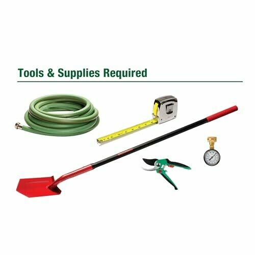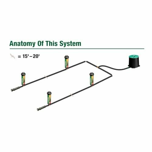 • 90’ of 1/2" distribution tubing, (4) 32SA geared pop-up rotary sprinklers, pull-up/adjust tool, “click-n-go” hose connection, fittings, Teflon tape, (2) filtered drain valves. Recommended operating pressure 40 to 75 PSI; minimum water flow 6-gallons per minute (GPM).